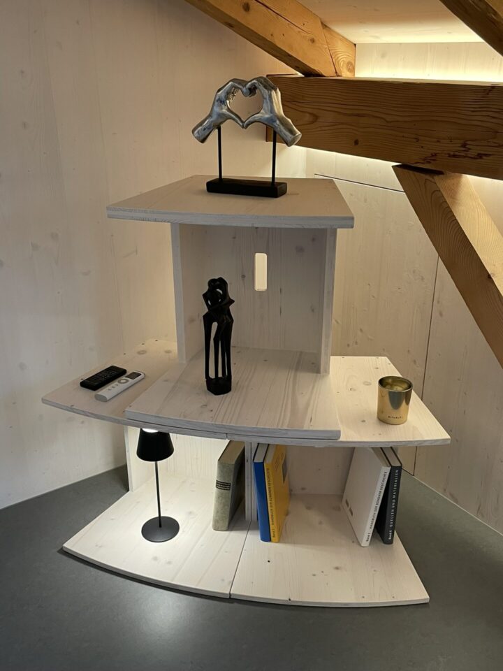 Der Hocker besteht aus lediglich 5 Teilen, die miteinander verschraubt werden. Die abgrundeten Seitenteile ermöglichen ein leichtes Schauckeln während des Sitzens. Dreht man den Hocker um 90°, kann dieser als Tisch oder Regal genutzt werden. Die Fotos zeigen ein paar Kombinationsmöglichkeiten auf.