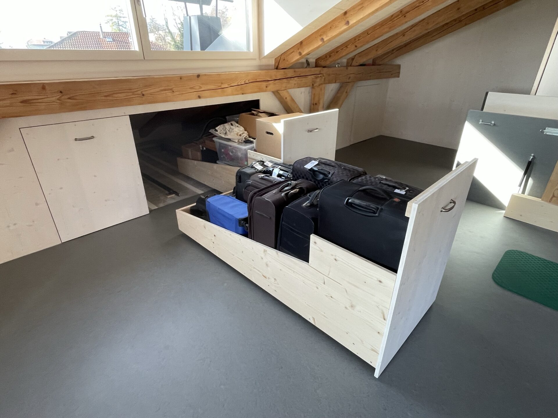 Das Grundprinzip ist die Schublade. Man zieht sie raus, legt etwas hinein und schiebt sie wieder rein. Genau so funktionieren die Wagen, die ich entwickelt und gebaut habe. Man zieht sie aus der Wand, belädt sie und schiebt sie wieder rein. Alles ist ordentlich versorgt und bleibt gut auffindbar, ohne dass man auf den Knien unter dem Dach rumsuchen müsste.