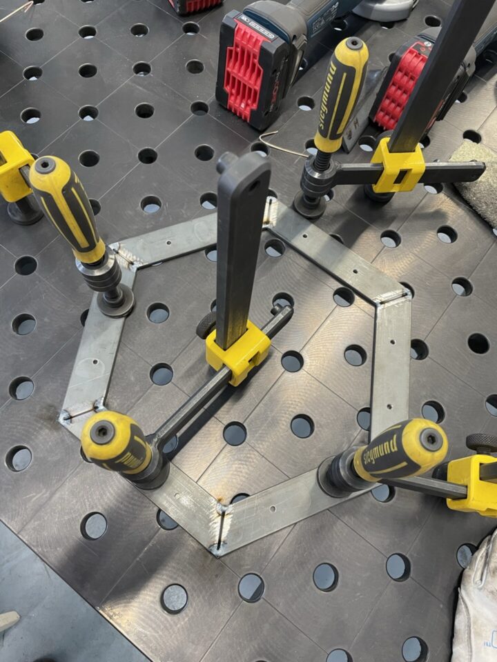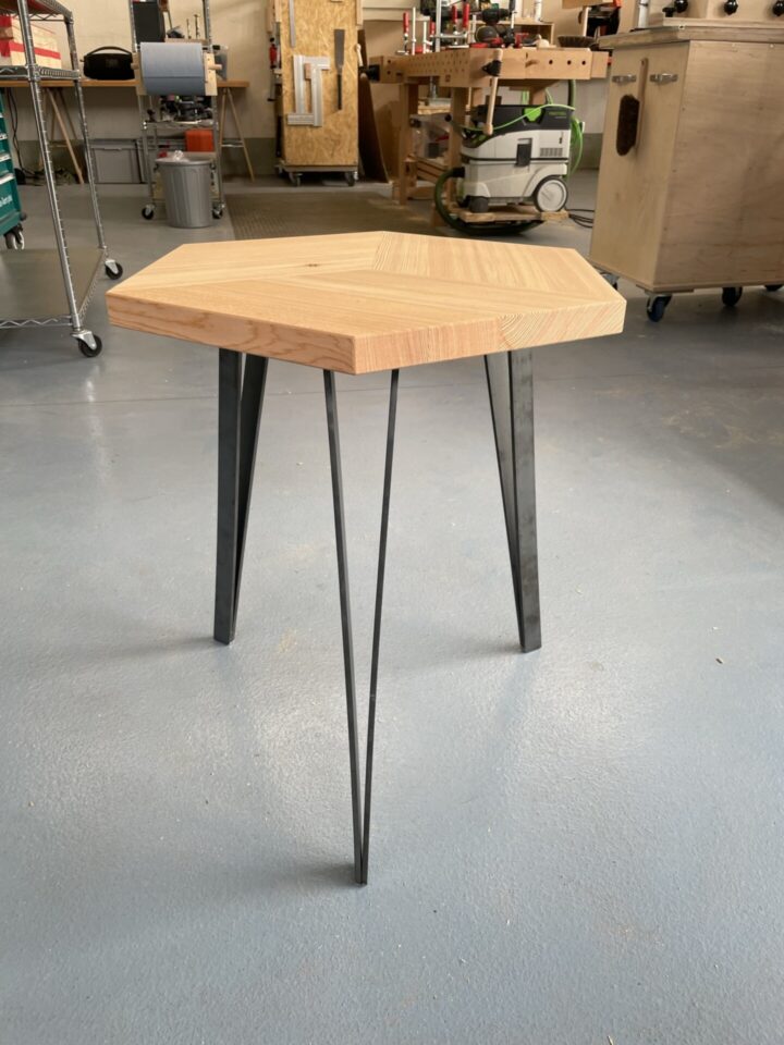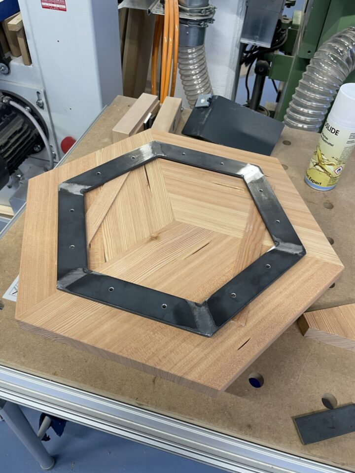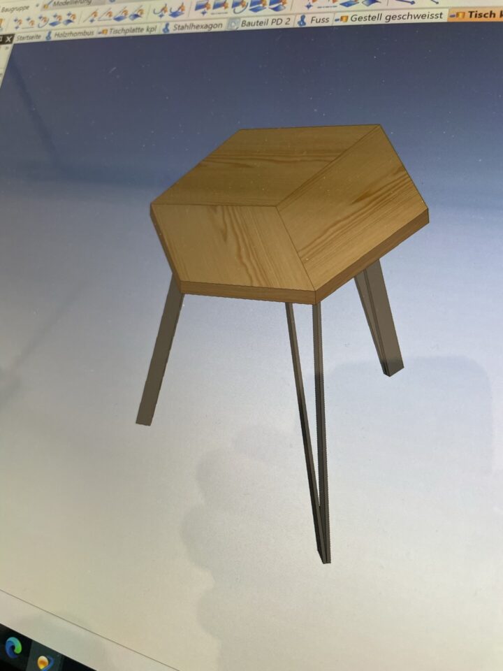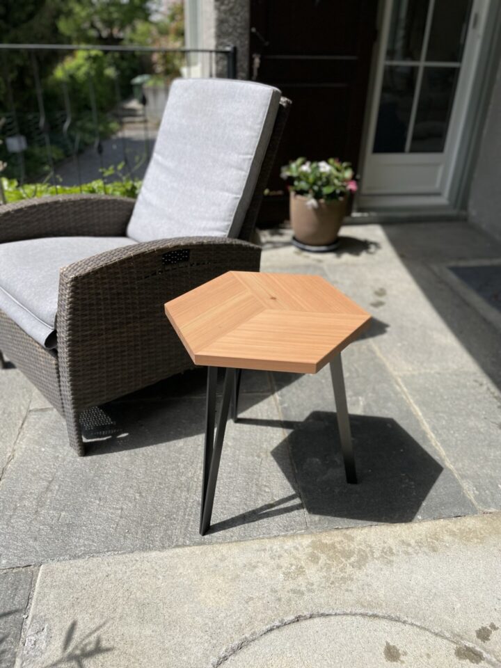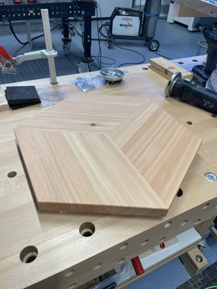 Tischplatte mit 3D-Effekt, infolge der verleimten Rhomben.