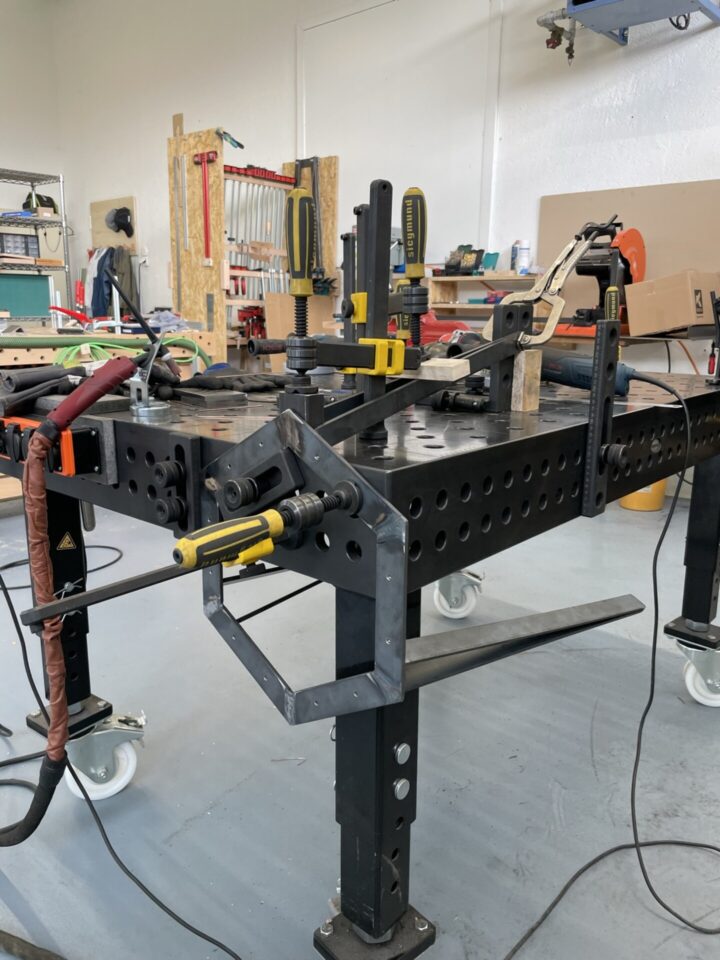 Die Füsse erscheinen filigran, sind dank der gespreizt verschweissten Profile jedoch sehr stabil. Wackelfreier Stand dank Dreibein-Ausführung.