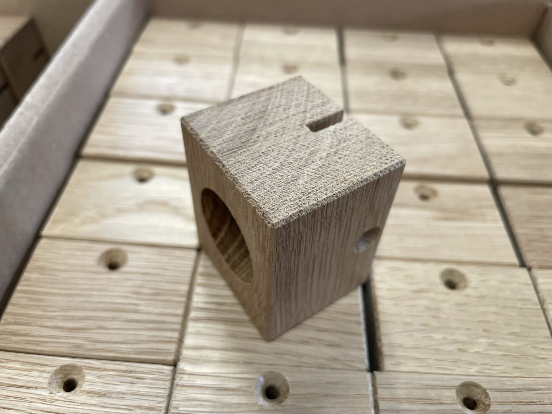 Ich schlage ihr als Grundplatte für die Plattform eine gelaserte Lochplatte aus Stahl vor. In den Löchern können Gewindestangen mit jeweils 2 Muttern vertikal zur Platte fixiert werden. Die Halterungen für die Fotos werden aus Eichenholz gefertigt.