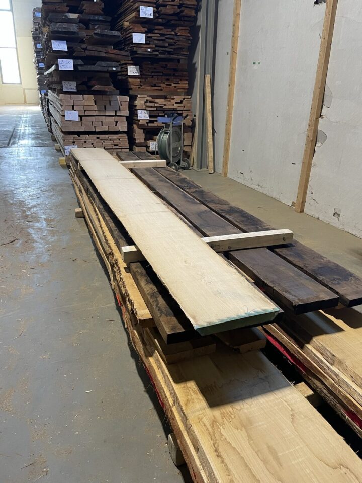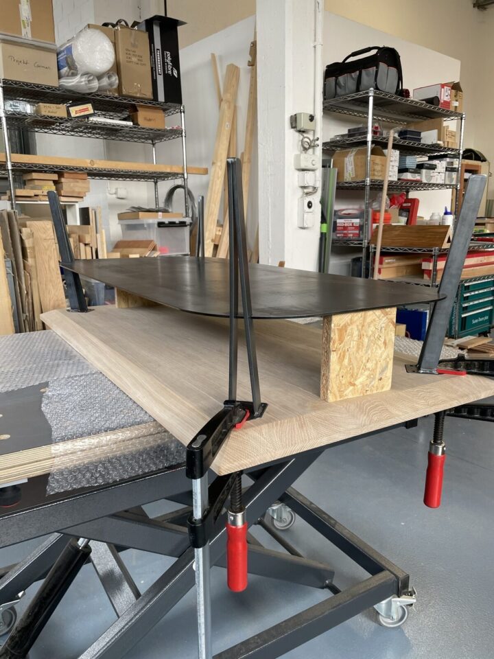 Die Eichenplatte ist aus Klotzbrettern in der Augangs-Stärke 40 mm gefertigt. Die Faserung ist eher ruhig, praktisch ohne Äste. Die fertige Tischplatte weist eine Stärke von gut 30 mm auf. Um diese doch recht massive Platte filigraner und leichter erscheinen zu lassen, versehe ich diese mit einer Schweizerkante (umlaufende Schräge).