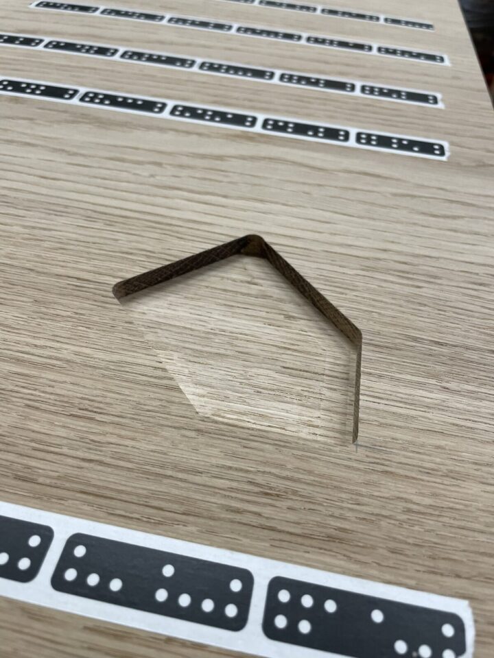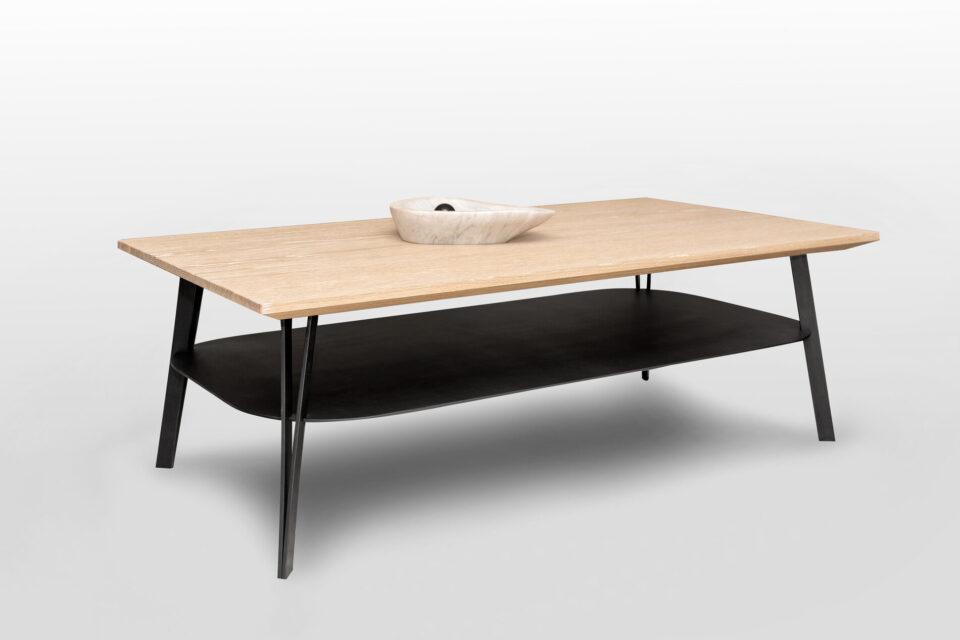 Die Kunden besitzen einen Salontisch dessen Tischplatte aus einer Spanplatte in Eichenimitat besteht. Darunterliegend ist eine zweite Platten-Ebene in scharzer Ausführung.