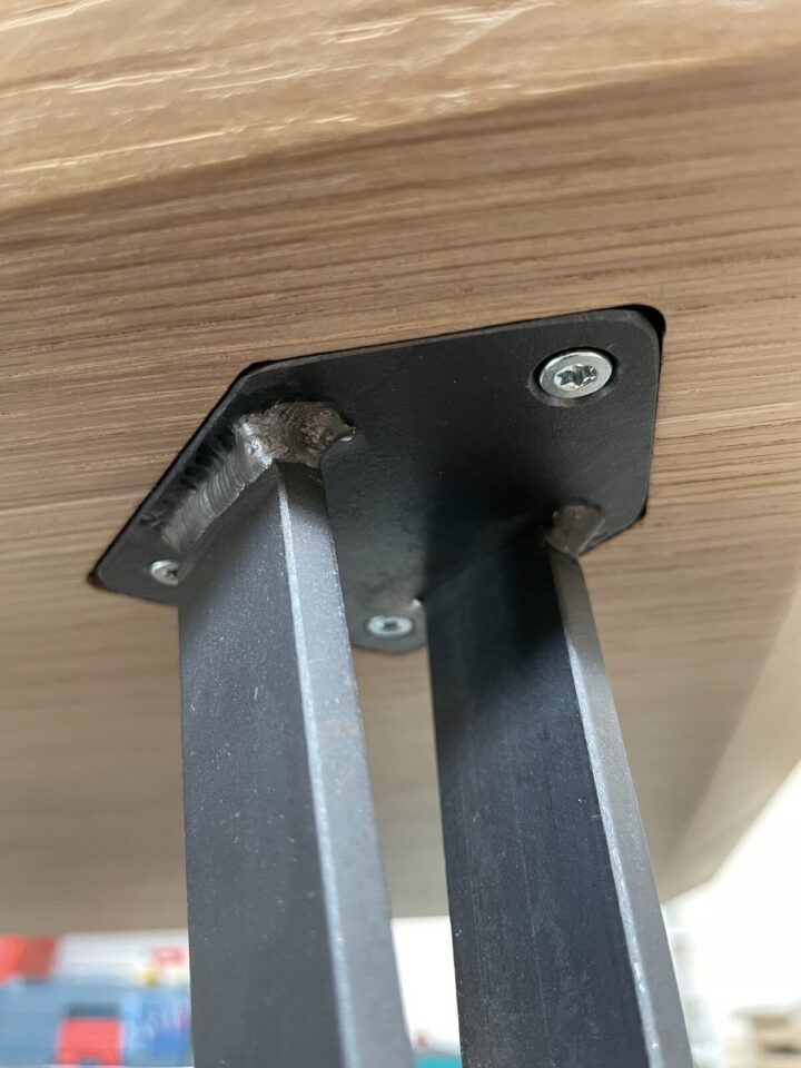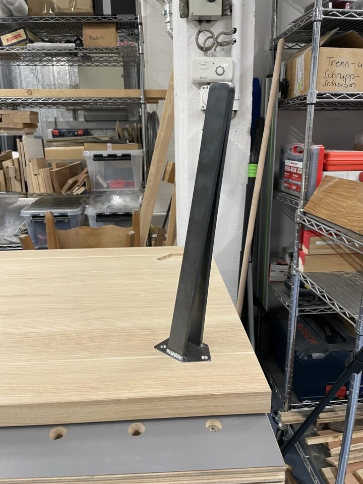 Die geschweissten Füsse wirken leicht. Deren Kopfplatte ist bündig in die Eichenplatte eingelassen. Die 4 mm dicke Stahlplatte ist lasergeschnitten und wird mit unsichtbaren feinen Schweissnähten an den Füssen befestigt.
